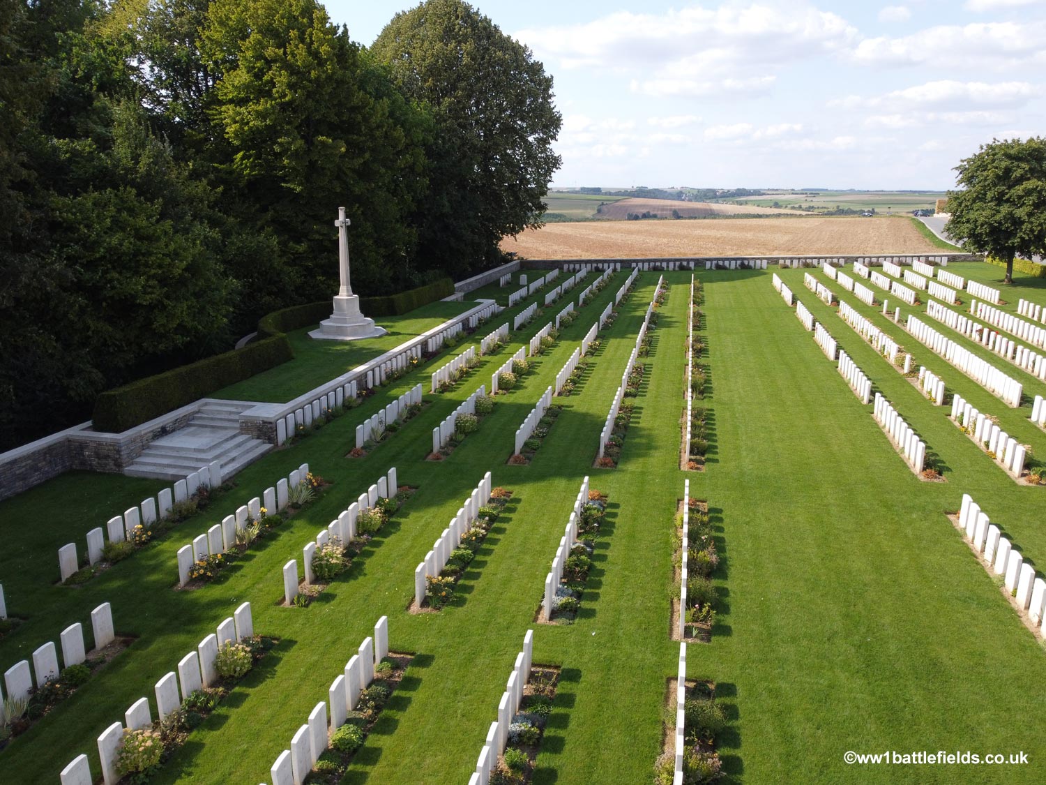 The cemetery has an attractive layout, with two grass walkways and conifers flanking the rows of graves. At the back right are special memorials to five soldiers killed in 1916 and buried in Divion Rd Cemetery No. 2, whose graves were destroyed in later battles. There are special memorials at the back left to men who are believed to be buried here in Connaught Cemetery.