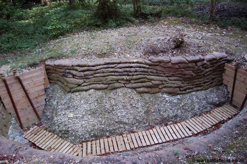 A bunker which was probably originally made by the French when they held these lines has also been excavated. There are shell-holes to be seen in the wood, and one particularly large crater near the dugout. Red stone chip paths run around the site, and further into the wood hunting lodges can be seen. In another section of excavated trench, the entrance to a dugout has been uncovered.