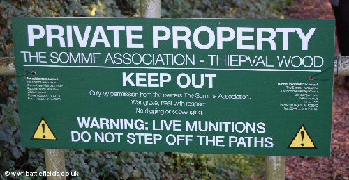 A guided tour around the trenches can be booked in advance through the Ulster Memorial Tower Visitor Centre. The tours are usually daily, except for Mondays, from March until November. A contemporary map reproduced near the entrance shows some of the trenches which are visited in the wood. This map (made by the 16th RIR Pioneer Battalion of the 36th Ulster Division) shows the wood as it was in June 1916, and the circles near the front line were gas cylinders, in four sets of four, ready for use in the attack on the 1st of July.