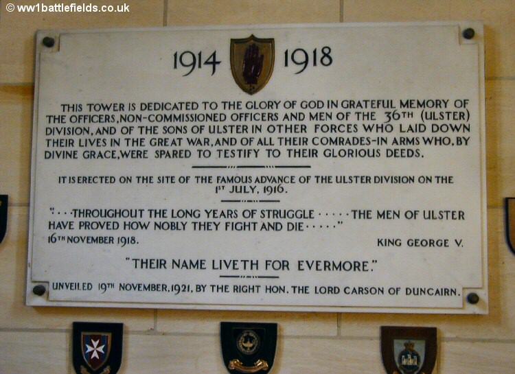 The tower, which is 70 feet high, was unveiled by Field-Marshal Sir Henry Wilson on the 19th of November, 1921, at a ceremony also attended by French dignitaries. The tower was dedicated by the Primate of All Ireland, the Moderator of the Irish Presbyterian Church and the President of the Methodist Church in Ireland. At the time it was described as the most imposing monument on the Western Front; it was certainly one of the earliest. Trees from Ulster were planted here by survivors from the 36th Division.